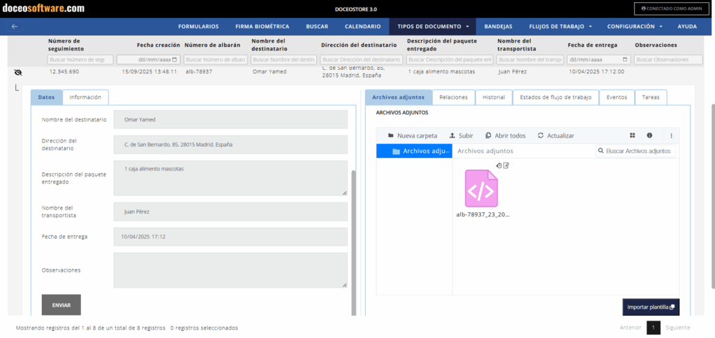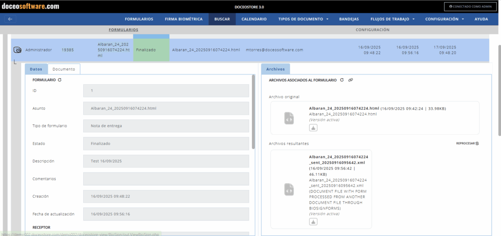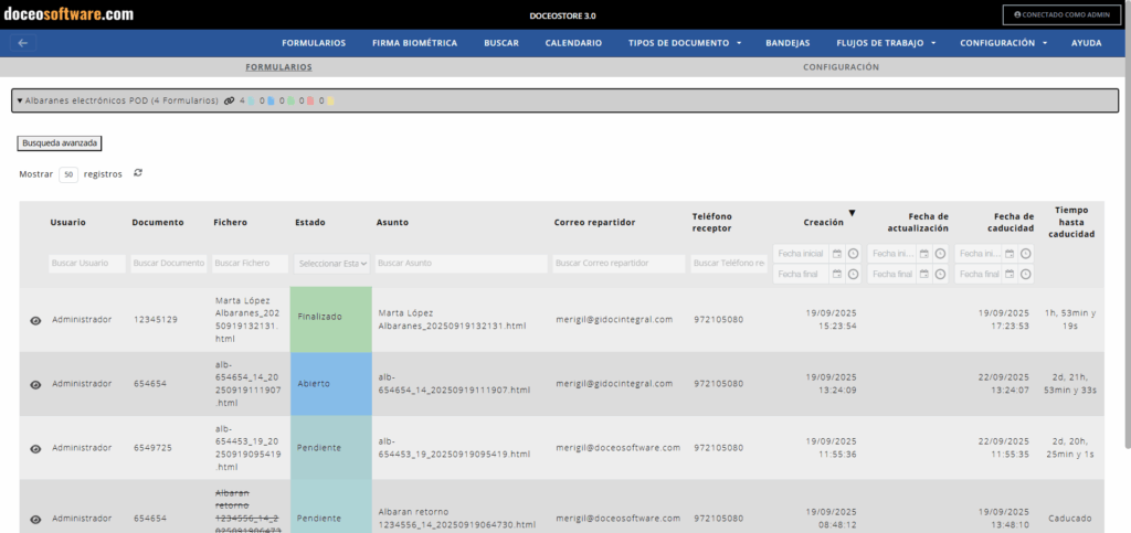 En Doceo BioSign Store, el responsable de la recepción de los documentos firmados recibe el documento firmado. Ve en tiempo real el cambio de estado de los documentos, en una pantalla similar a la siguiente: