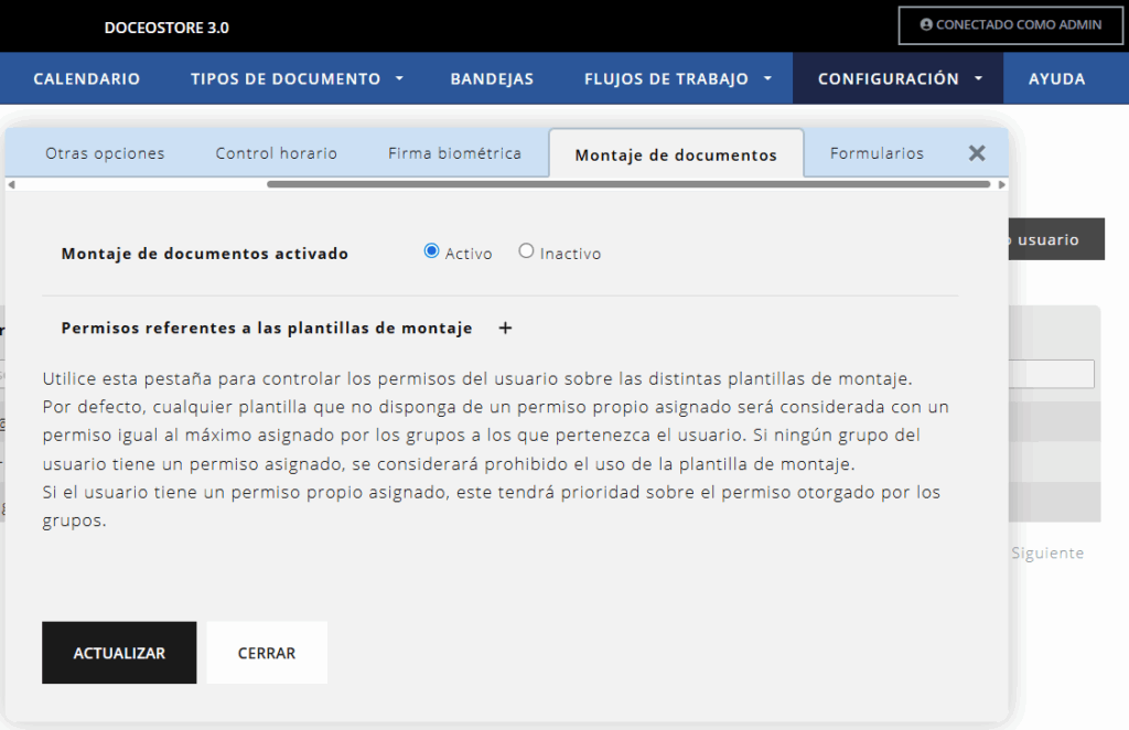 Como hemos visto en el apartado CONFIGURACIÓN > USUARIOS / GRUPOS, donde podemos, entre otras cosas, crear nuevos usuarios, vincularlos a grupos, gestionar contraseñas, idiomas y permisos detallados hasta el nivel de atributo, también podemos gestionar los permisos de MONTAJE DE DOCUMENTOS y de FORMULARIOS.