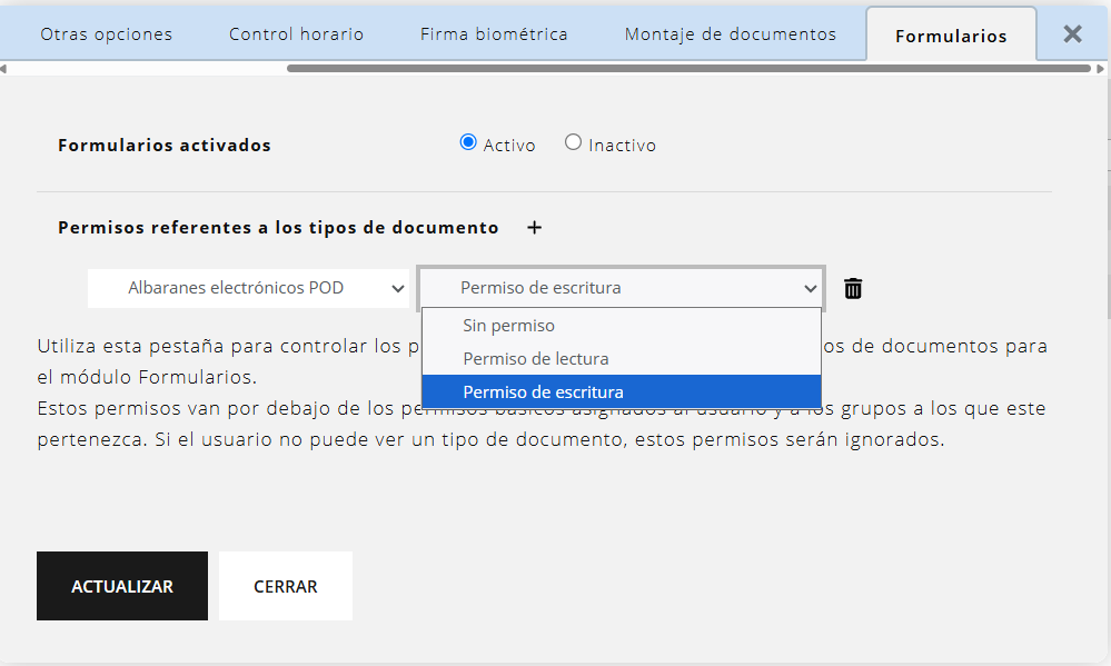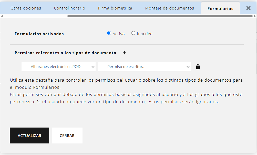 Utiliza esta pestaña para controlar los permisos del usuario sobre los distintos tipos de documentos dentro del módulo Formularios.