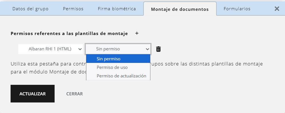 Los permisos sobre las plantillas de montaje se pueden asignar individualmente por cada plantilla, y las opciones disponibles son: