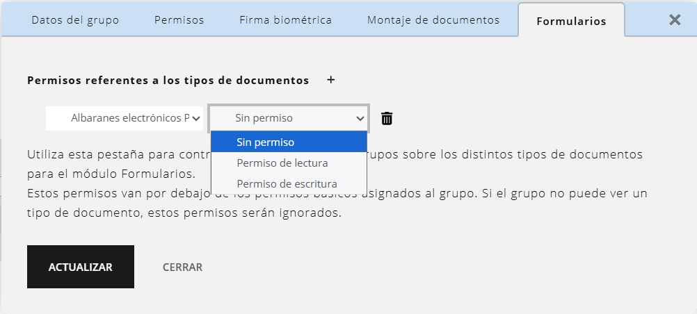 Estos permisos son complementarios a los permisos básicos asignados al usuario y a los grupos a los que pertenece. Es decir, si un usuario no tiene acceso a un tipo de documento por los permisos generales, los permisos específicos de esta pestaña serán ignorados.