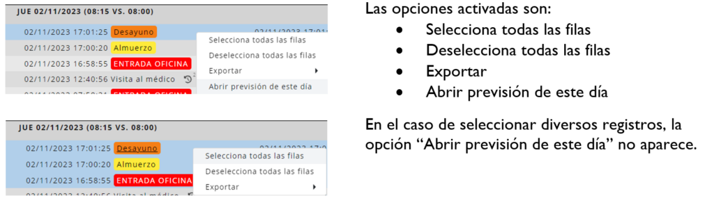 Nos referimos a la tabla central en el que están todos los registros horarios. Como ya hemos avanzado, cada registro corresponde a una acción realizada desde el Comando de fichaje. Los registros permiten las siguientes opciones. Para activarlas, el usuario debe seleccionar uno o diversos registros.
